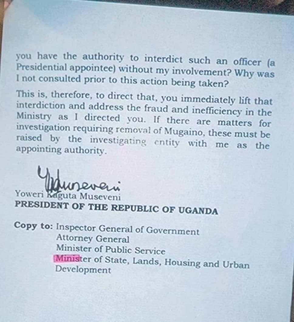 Copies of the President’s directive were sent to the Inspector General of Government, the Attorney General, the Minister of Public Service, and the Minister of State for Lands, Housing and Urban Development, signaling the broad implications of the issue and the President’s clear intent to ensure his directives are followed without obstruction.