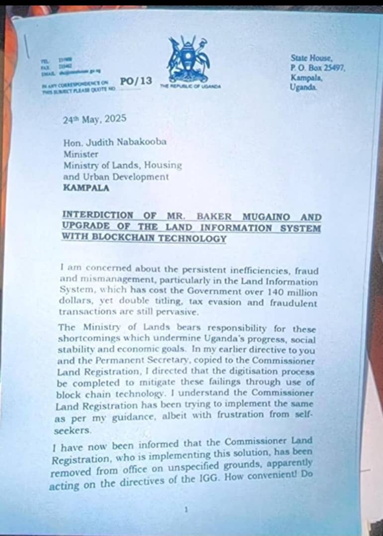 The President's order, communicated in a strongly worded memo to the Minister for Lands, Housing and Urban Development, Judith Nabakooba, cited concerns over "persistent inefficiencies, fraud and mismanagement" within the Land Information System.